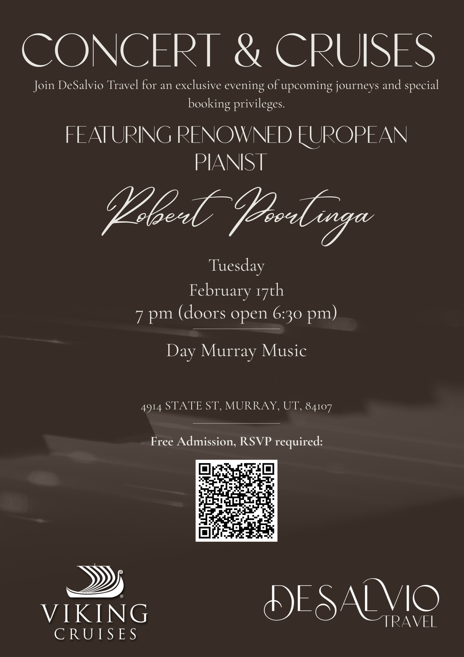 Day Murray Music Education House 4914 South State Street, Murray, UT, United States🎹 Robert Poortinga – Free Piano Concert 📅 When: February 17, 2026 🕙 Time: 7pm (doors open at 6:30pm) *RSVP Required* 📍 Where: Day Murray Music, 4914 S State St, […]